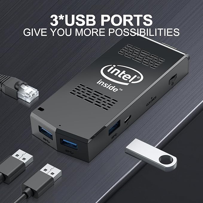 • 【MORE HUMANIZED DESIGN】Unlike traditional mini compute sticks,We take into account the needs of our user, This mini computer stick Equipped with 3 USB ports, easily connecting to other devices, allow you to deal with multiple tasks and projects easily at the same time. No more worrying about not having enough USB ports to use.